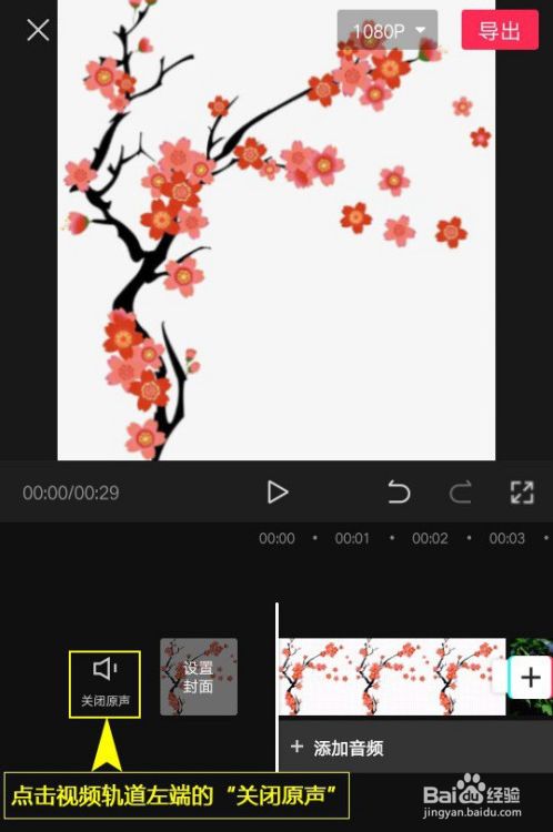 封闭原声。若是对视频的原声不对劲的话,点击视频轨道左端的“封闭原声”。