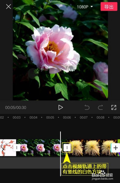 5、选择转场。点击视频轨道上两个视频间带有竖线的白色方块。