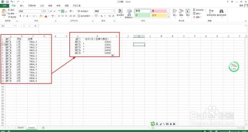 B列到D列是各部分1到3月的业绩环境——在E列合计各部分的业绩环境并去失落小数点。