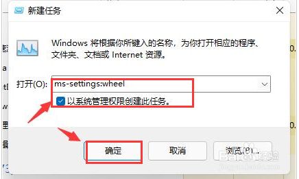 2.勾选以系统办理权限建立此使命选项,在完当作ms-settings:wheel输入后点击确定按钮
