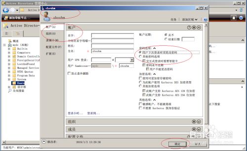 勾选"账户→密码选项→用户下次登录时须更改密码"单选框
