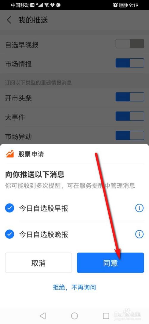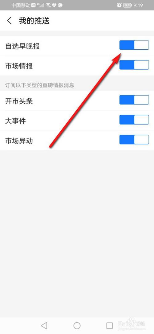 将“自选迟早报”旁的小滑块点亮即可推送自选股迟早报。