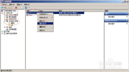 鼠标右击"用户→Administrator"图标,选择"重定名"项