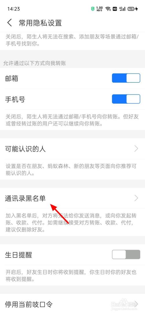 在常用隐私页面,点击通信录黑名单。
