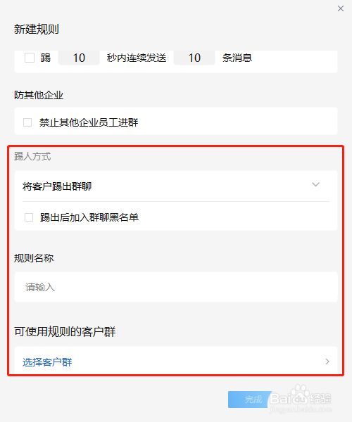 最后设置好踢人的体例和法则联系关系的客户群,点击“完当作”按钮即可。