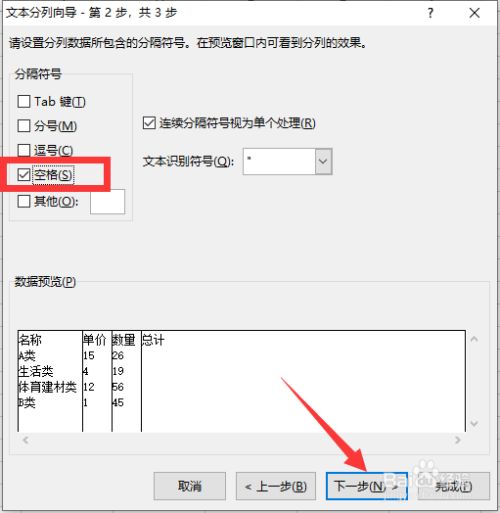 接下来,我们选择分隔符号的类型,在此,我们按照文本的现实朋分符号的类型及其选择,此次我们选择空格,点击下一步按钮。