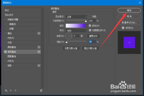在图层样式的对话框添加渐变结果下调整相关的参数选择”确定“按钮
