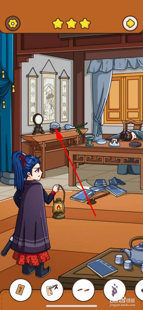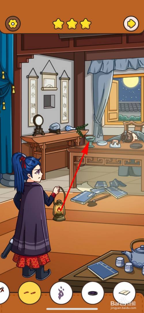 灯盏点着后,会主动熄灭。点击上面冒出的烟雾,即可获得第三件物品。