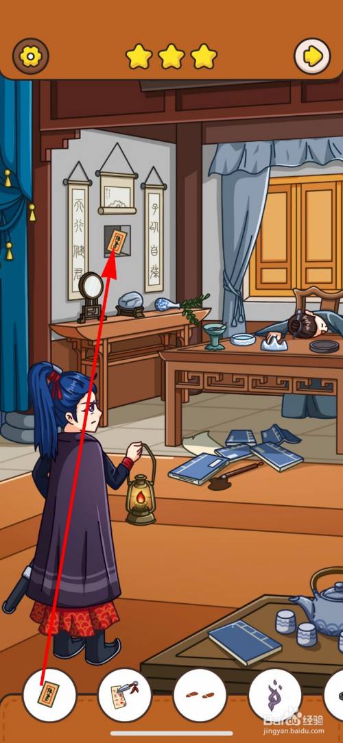 五样物品收集齐后,会从外面飞来一只飞镖,上面有一张字条,点击飞镖和字条即可获得第六件物品。
