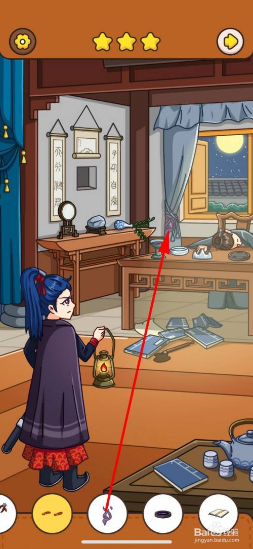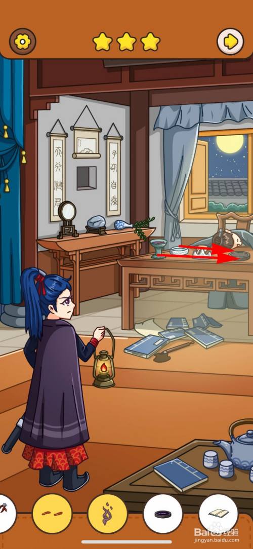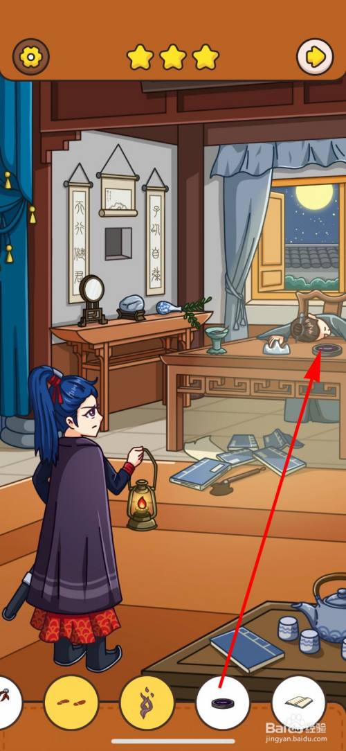 窗户打开后,经由过程透进屋内的月光可以清晰的看到脚印,点击脚印即可获得第二件物品。