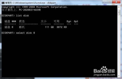 输入select disk 0,按回车。