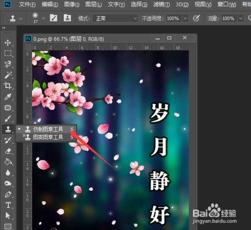 接下来,我们对文字四周的布景色进行取样,同时,操纵仿制钤记进行涂抹以消弭文字,同时,操纵布景对其文字进行填充。
