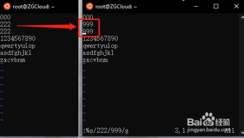 此处演示的号令“:%s/111/222/g”意思为将所有的“111”替代为“222”。