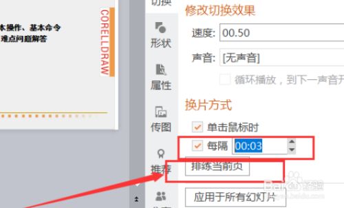 我们将每隔时候设置为3秒,点击此中的排演当前页,这样就设置了零丁PPT页面的显示时候。