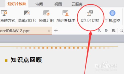 打开演示文稿后,单击菜单栏幻灯片放映,然后单击属性栏中的幻灯片切换,以查看右侧的幻灯片切换属性栏。