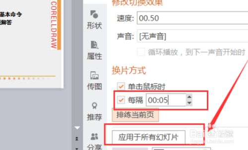 将时候距离设置为5秒,然后单击应用于下面的所有幻灯片。这将设置所有幻灯片的显示时候。天天的这个时辰城市放映幻灯片。