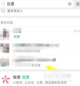 我们换一个关头词好比百度,这里默认会先搜刮朋友圈的内容,若是没有找到就会接着找我们的聊天记实等。
