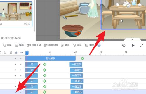 此时点击布景上的桌子。找到桌子在时候轴上对应的名称。