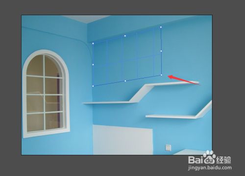 在消逝点编纂界面中,我们操纵矩形东西绘制如图所示的矩形,而且将对应的贴图粘贴到此中,并调整位置。