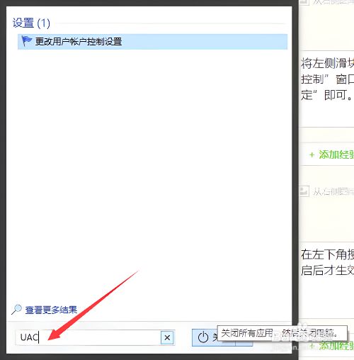 在左下角搜索框直接输入UAC也是可以快速打开这个窗口进行点窜设置的,重启后才生效。