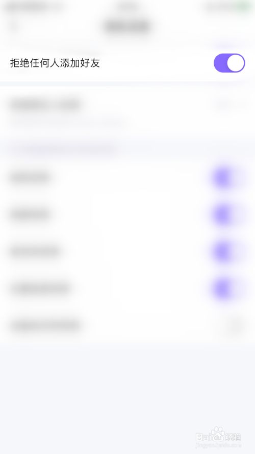 “拒绝任何人添加老友”后面的圆点变为紫色即暗示开启蛋蛋部落拒绝任何人添加老友当作功