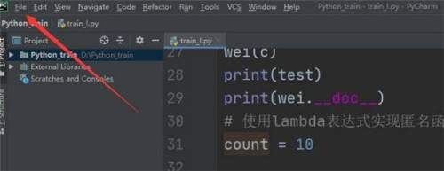 然后,在pycharm本家儿界面点击上方东西栏的file,如下。