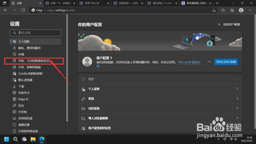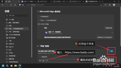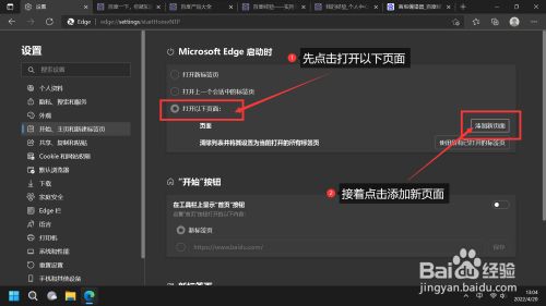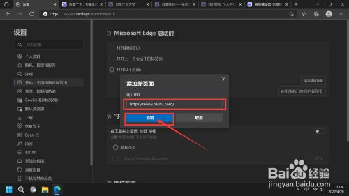 按如图所示操作,点击“起头,本家儿页和新建标签页,在右边栏Microsoft Edge 启动时下边,选择”打开以下页面“,点击”添加新页面“,接着在弹出的对话框输入URL:”https://www.baidu.com/“,并点击添加按钮。