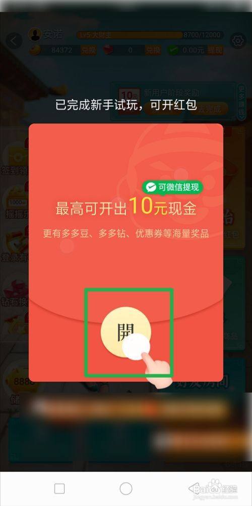 如图所示,新手试玩即可获得提现红包,选择“開”。