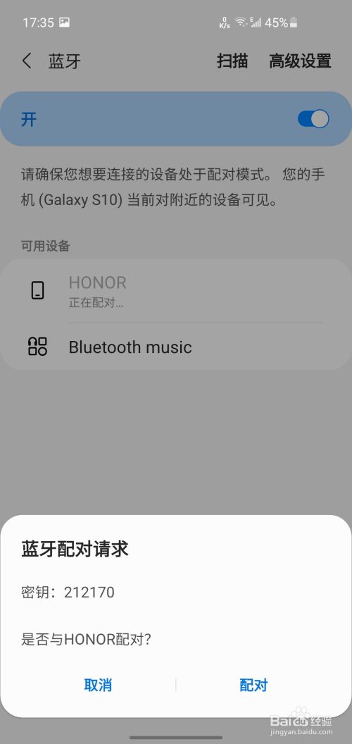 点击手机端蓝牙界面右上角的扫描功能扫描当前可毗连的设备,选择设备点击毗连即可,若是是与其他手机进行毗连,需要在两把手机进行配对操作(如图),点击配对即可