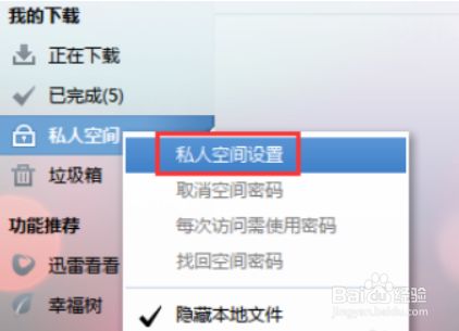 鼠标右键点击左侧菜单栏里的【私家空间】选项,弹出下拉菜单,鄙人拉菜单里能看到私家空间设置选项。