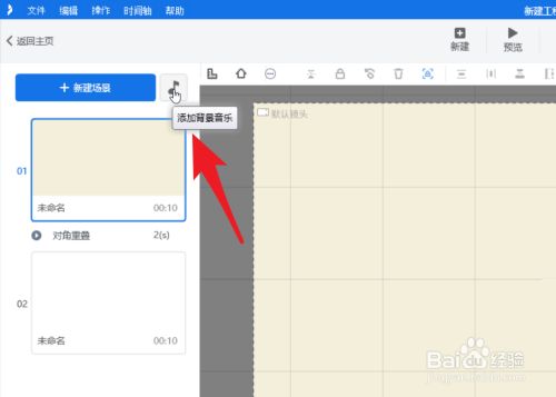 如下图,打开一个工程文件,点击“新建场景”右侧的“添加布景音乐”按钮。