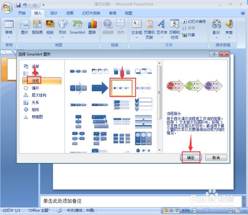 在选择SmsartArt图形页面中点击流程图,选择流程箭头,按确定;