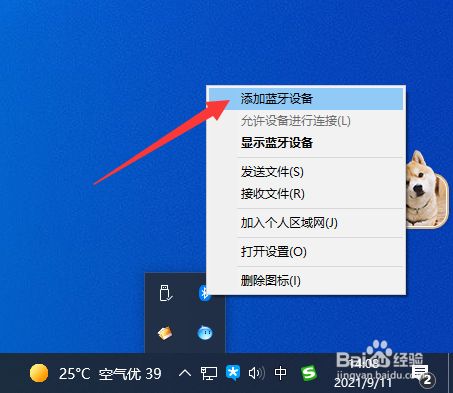 接下来我们在笔记本电脑上右键使命栏如图所示的蓝牙图标,从弹出的列表中选择添加蓝牙设备选项。