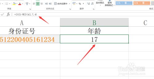 首先,我们打开如图所示的WPS表格,在想要提取春秋的单位格中,输入如图所示的公式,操纵此公式提取证件号中的年份信息。