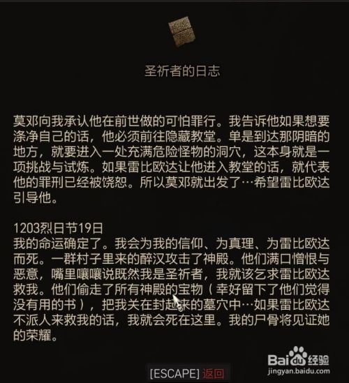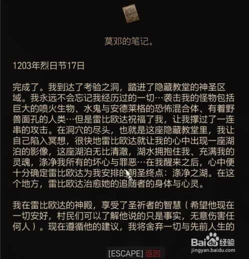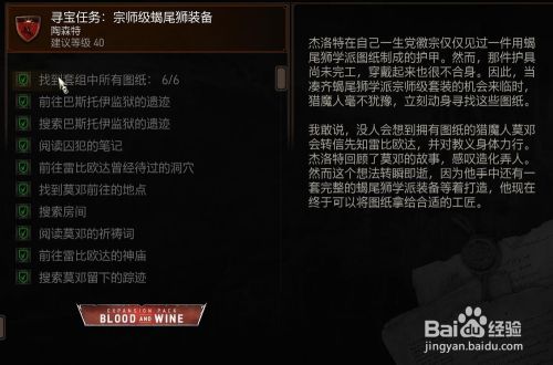 工具/原料SwitchLiteSwitch11巫师31.3.1方式/步骤1使命触发是在城镇里的铁匠铺和npc对话触发(委托不只是巨匠)2之后前去巴斯托伊牢狱遗迹3在遗迹中爬上边上的高台 里面可以找到宗师级蝎从头至尾狮钢剑4前去雷比欧达曾经呆过的洞窟 里找到莫邓的祷告词5再到先知的神庙 找到埋没的石门 进去 击杀祷告者的魂灵 可以在密屋中找到蝎从头至尾狮裤子、靴子蓝图6阅读圣祈者的日志 触发前去有着隐藏教堂的洞窟7进入洞窟 击杀两个女吸血鬼 举措措施乞丐 击杀怪物救出村民(其实都是幻觉)8就可以达到洞窟绝顶 获得蝎从头至尾狮银剑蓝图 和莫邓笔记9阅读后 触发前去涤净之湖10在湖底的宝箱中可以获得最后一个蝎从头至尾狮手套蓝图END