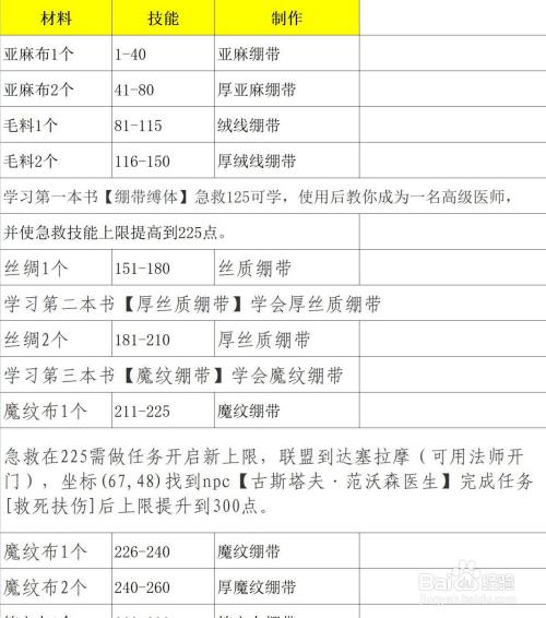 急救在225需做使命开启新上限,到“卡利姆多”的塞拉摩(FS可开门曩昔),坐标(67,48)找到npc【古斯塔夫 范沃森大夫】完当作使命[救死扶伤],上限晋升到300点。这个使命NPC会给您一个道具绷带来完当作救治15人。225-300技术晋升与进修在这个NPC完当作(部落到ALX盆地)。