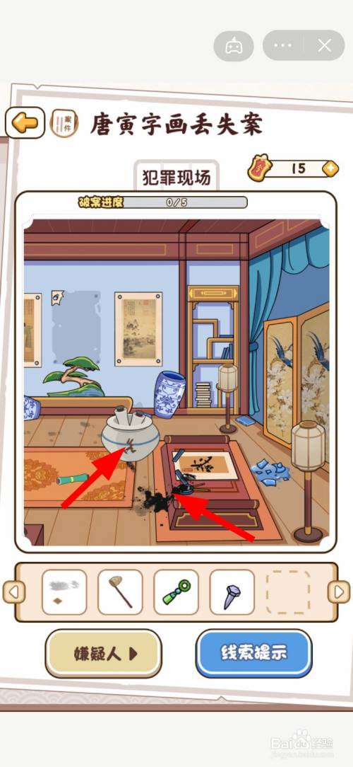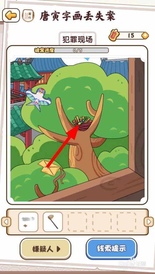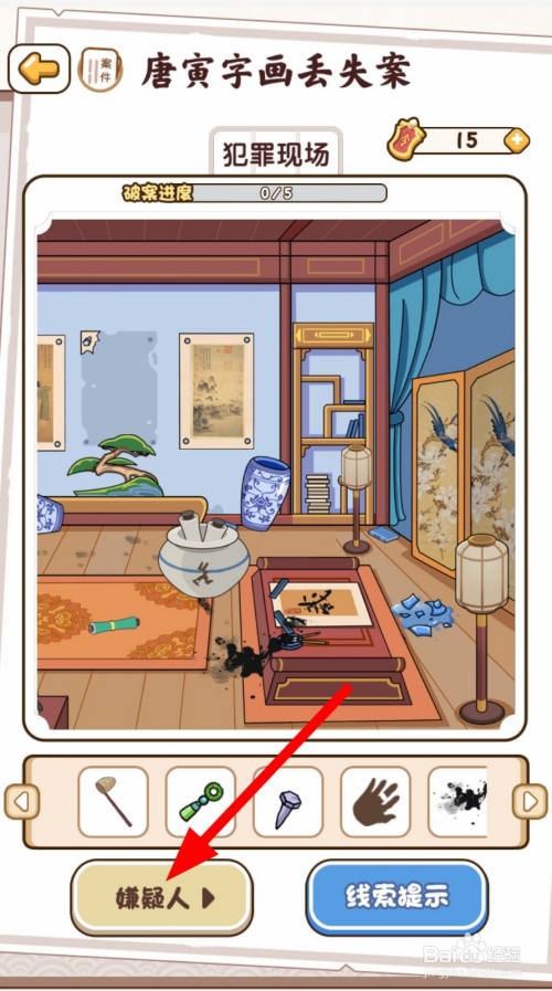 之后,收集5个物证后,点击左下角的嫌疑人按钮。