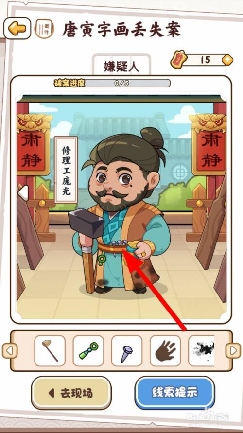最后,按右边的箭头找到嫌疑人补缀工庞光,将脚印(拖动到补缀工的手杖上),玉佩(拖动到腰间缺了一半的玉佩上),钉子(拖动到腰间别着的钉子上), 手印( 拖动到补缀工戴戒指的手上),墨汁(拖动到补缀工身上的墨汁 处)后,就可以当作功了案了。