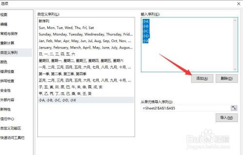 除了以上方式外,我们还可以将表格中的序列作为新序列添加到自界说序列列表中,如图所示,在选项界面中,选择表格中的数据区域。点击导入按钮。
