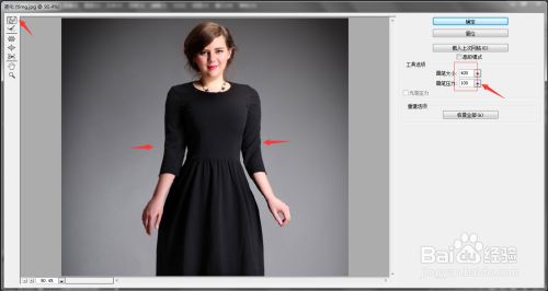弹出液化窗口,利用标的目的前变形东西,调整画笔巨细(画笔恰当大一些),在人物腰身的双方别离单击,然后标的目的中心拖动,如图