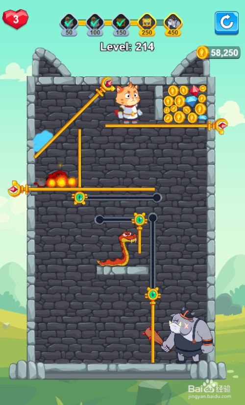 工具/原料三星Galaxy Tab S7安卓Android 11Hero Save the Princess1.0.1方式/步骤1拔失落蛇左下侧的斜插销,如图。2滑动岩浆球右侧的推拉杆,蛇被除失落,如图。3滑动蛇右侧的推拉杆,滑到左端,如图。4滑动狗左侧的推拉杆,滑到上端,如图。5拔失落岩浆球下侧的横插销,狗被除失落,如图。6拔失落水右侧的斜插销,岩浆球被冷却,如图。7拔失落宝藏下侧的插销,橘猫获得宝藏,如图,顺遂过关。END