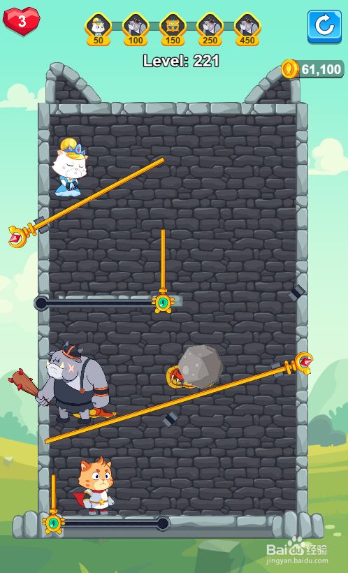 工具/原料三星Galaxy Tab S7安卓Android 11Hero Save the Princess1.0.1方式/步骤1拔失落蛇右侧的竖插销,如图。2拔失落狗下侧的斜插销,如图。3拔失落狗左侧的斜插销,如图。4点击滑动上侧的推拉杆,滑到右端,如图。5点击滑动下侧的推拉杆,滑到右端,如图。6点击滑动上侧的推拉杆,滑到左端,如图。7拔失落白猫公本家儿下侧的斜插销,如图。8拔失落橘猫上侧的斜插销,如图。9点击滑动上侧的推拉杆,滑到右端,如图。这样就过关了。END