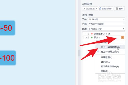 点击这个动画结果后的三角形,点击“与上一动画同时”。