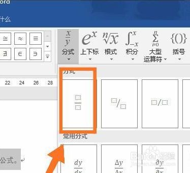 第四步,进入公式东西界面,可以看到这里有很多东西,要输入分数的话点击分式。