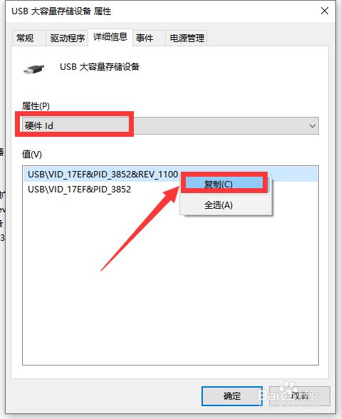 在打开的设备办理器界面后,我们睁开大容量总组设备,鼠标右击对应的选项进入属性设置界面,在此,获取设备硬件的ID信息。