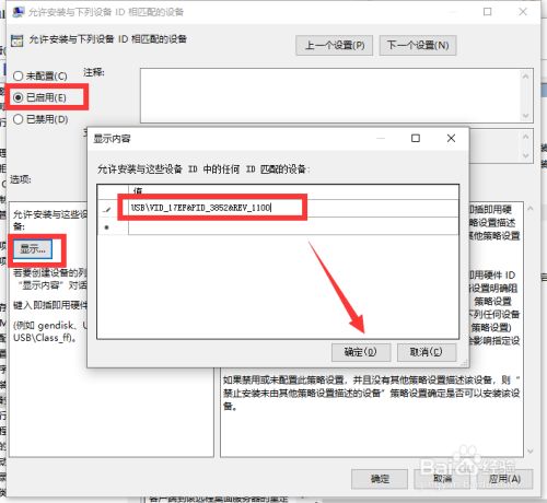 最后,在如图所示的许可安装与下列设备ID相匹配的设备属性设置界面中,开启以启用选项,同时,点击显示按钮,在弹出的窗口中,输入许可安装设备的ID信息,点击确定按钮即可。