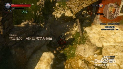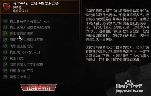 按着石壁上的藏宝图案提醒就可以找到 猎魔人的尸身和宗师级熊派裤子、钢剑、靴子的蓝图
