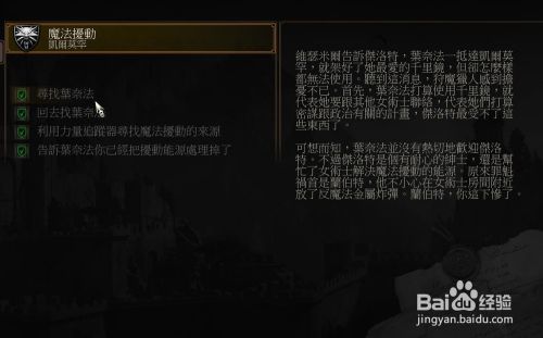 工具/原料SwitchLiteSwitch11巫师31.4.0方式/步骤1使命地址在凯尔莫罕里面的叶奈法的房间2和叶奈法对话后会获得一个魔法追踪器 可以在道具栏切换3之后利用追踪器 在楼下的大厅寻找干扰源 靠的越近 追踪器亮度越高4干扰源就在乌马和维瑟米而后面的箱子里5找打后就会主动触发剧情 在精灵术师口里扣问到解除乌马谩骂的方式END