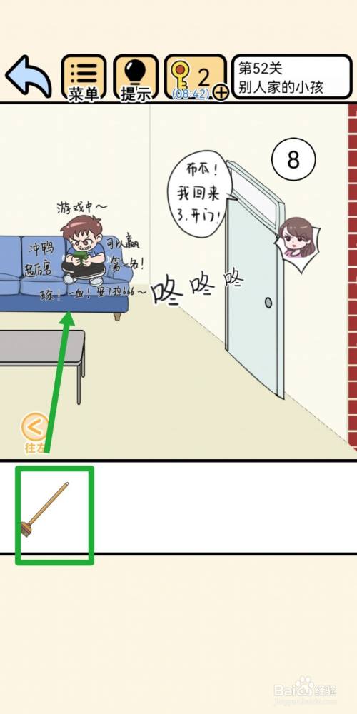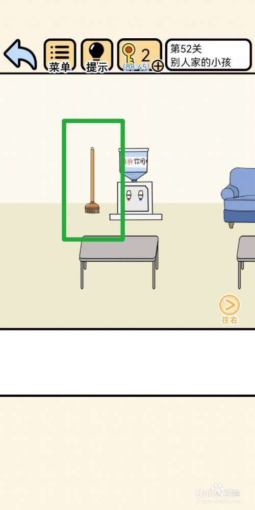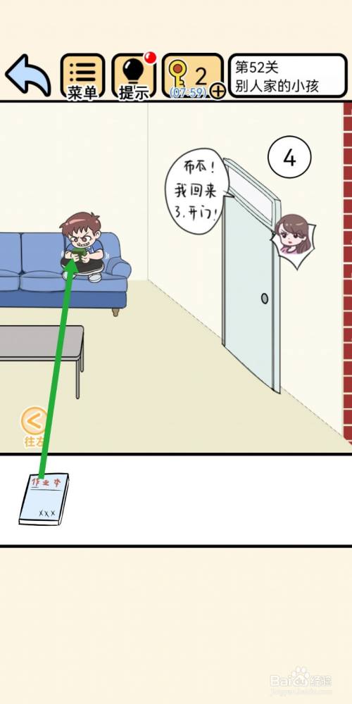 点击拖动【拖把】伸到沙发下面,可以拿到【功课本】。