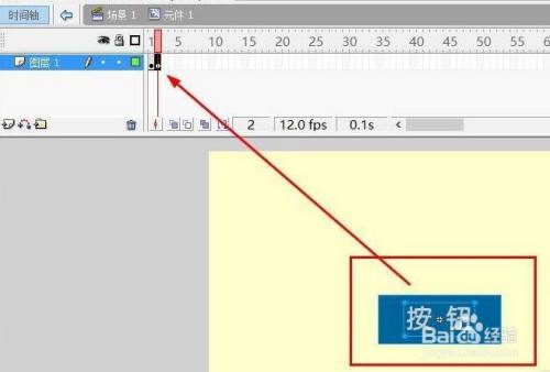 在这里,双击元件进入编纂状况,并添加第2帧,如图所示